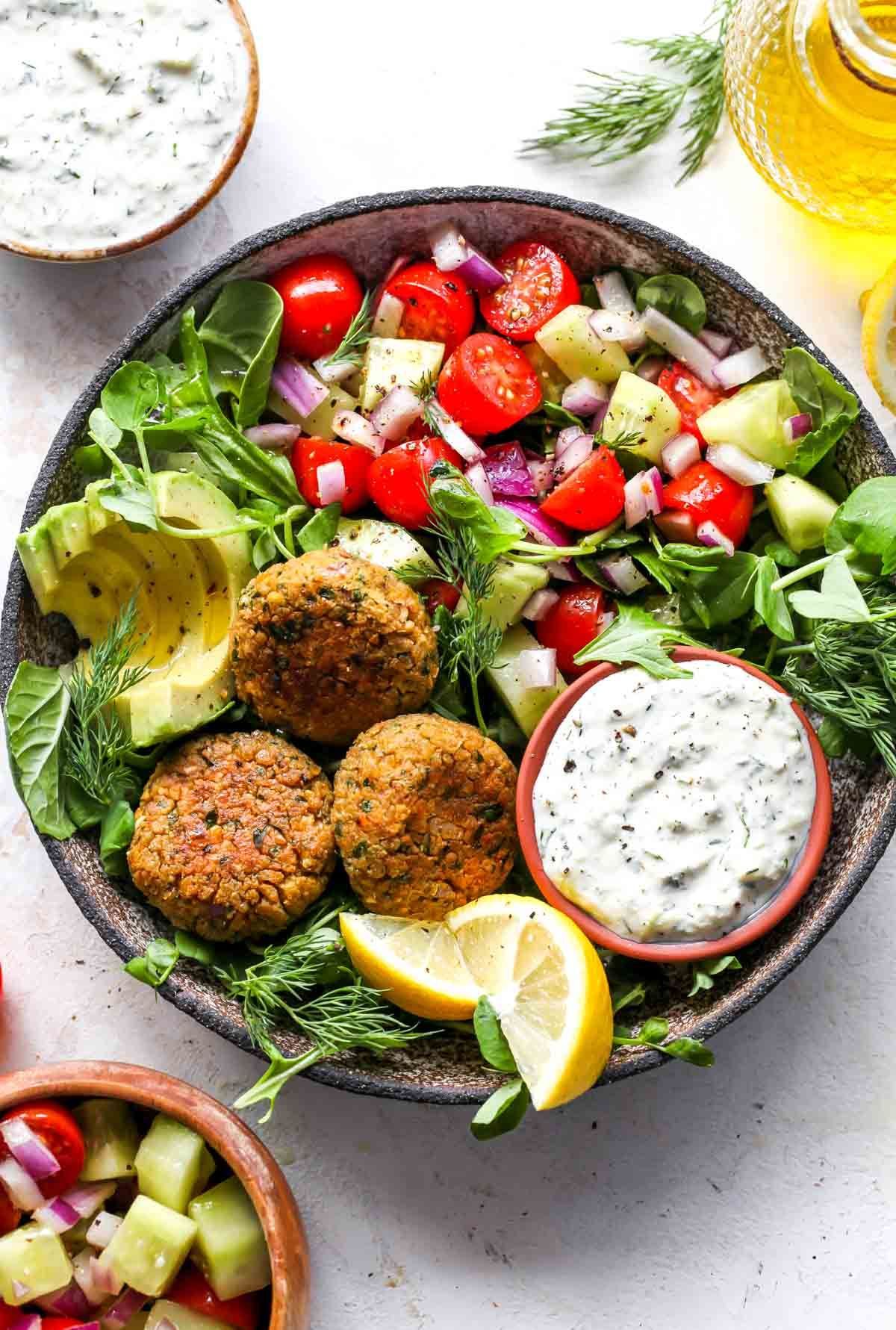 Tedd a salátát és a félbevágott paradicsomokat egy nagy keverőtálba, facsarj rá citromlevet, locsold meg extraszűz olívaolajjal, ízesítsd tengeri sóval, keverd össze, majd tedd egy tálalóedénybe. Helyezd rá a forró falafelgolyókat, locsold meg tahini szósszal, végül szórd meg aprított petrezselyemmel.