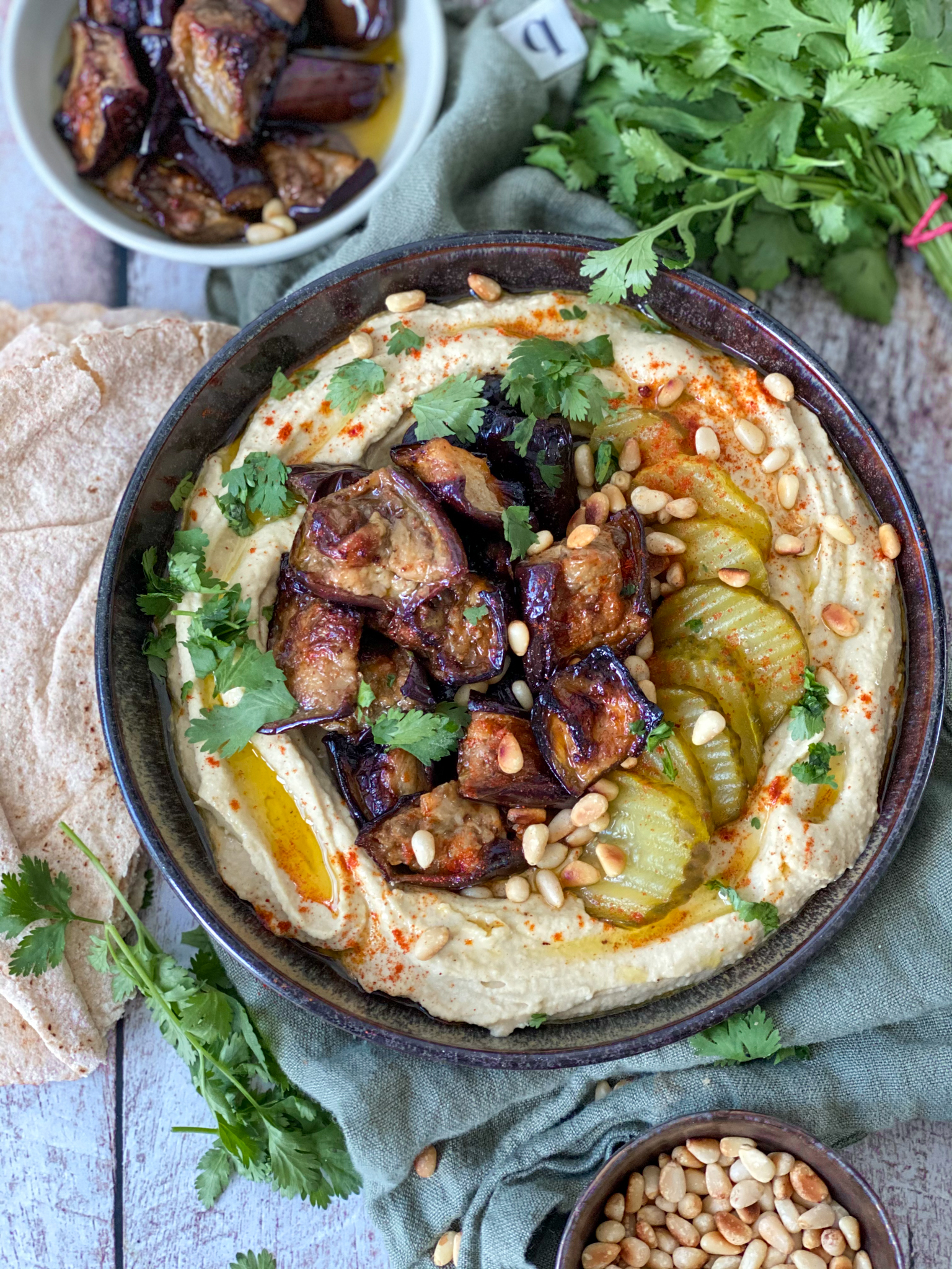 A hummuszt körkörösen kend el a tányéron, közepére helyezz paradicsomos padlizsánt, köré pedig szeleteld a tojást. Szórd meg pirospaprikával, locsold meg olívaolajjal, végül fűszerezd aprított petrezselyemmel vagy korianderrel. Tálald 2 Fanan pitával és Fanan chiliszósszal vagy csípős korianderszósszal.
