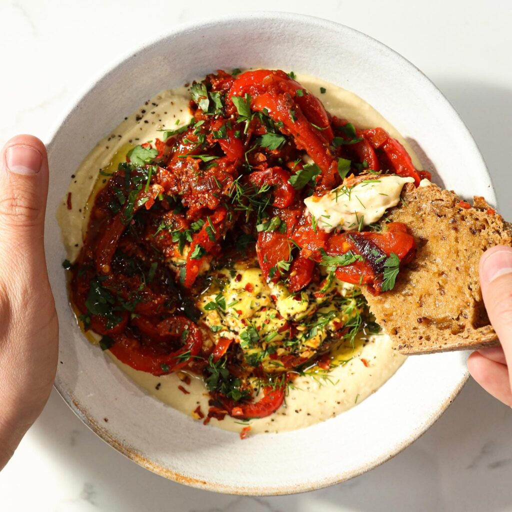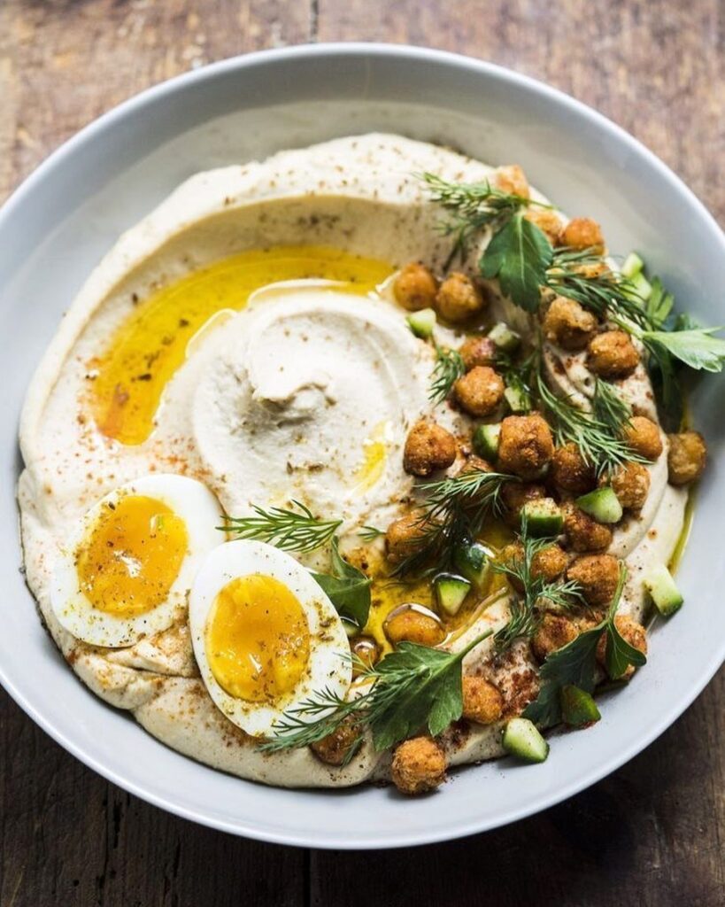 Hummusz paradicsomos padlizsánnal és főtt tojással